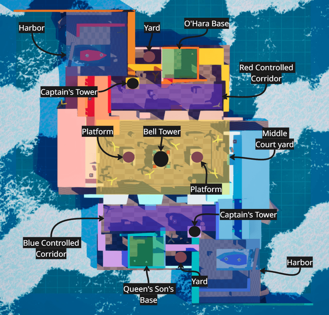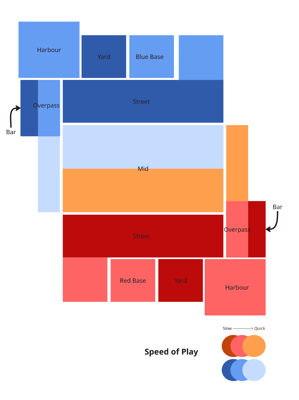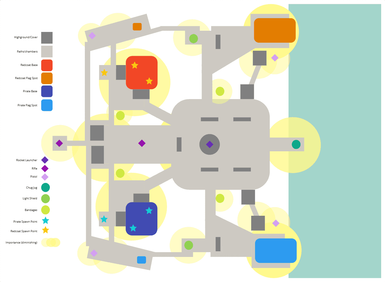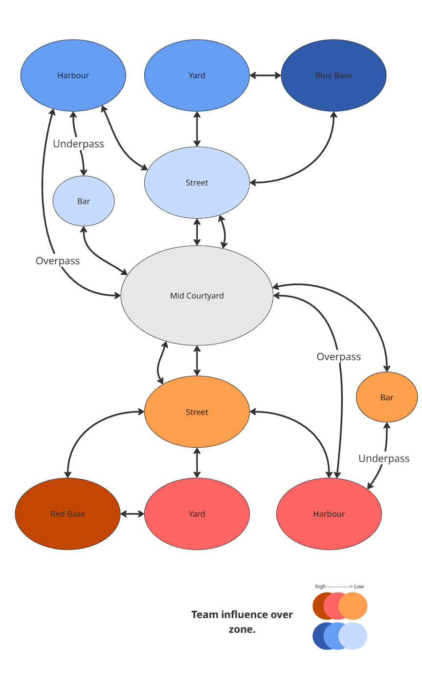 In order to succeed, I needed to keep track of several different level design principles at once, such as speed of play and map control. To do this, I created different diagrams of my map to show different focuses.