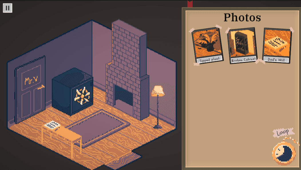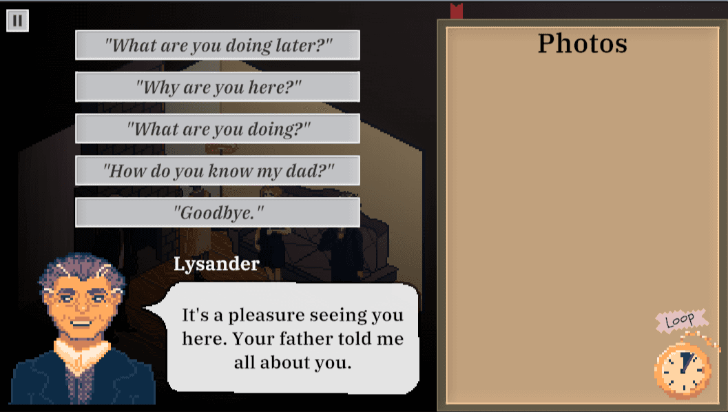Built as part of a program-wide game jam (called “design week”) at Sheridan College. Party Never Stops is a time-loop point-and-click mystery game about trying to prevent your father’s murder. Each time you fail, the time loop starts again!