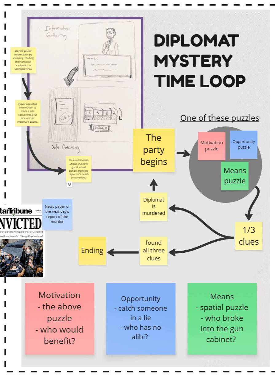 Here was my original pitch for the core loop of Party Never Stops, and the idea we decided to stick with. I decided to take advantage of the classic puzzle board-game Clue to create the three primary puzzle pieces the player needed to solve: Motive, Means, and Opportunity. While not revolutionary by themselves, the three puzzle pieces I proposed gave the game structure and clear goals that the player was likely to be familiar with already.
