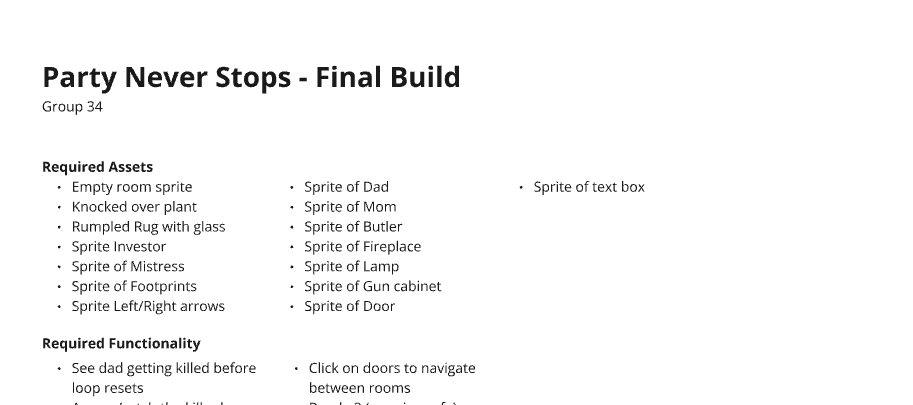 For Party Never Stops, our team created specific and detailed documentation on what was otherwise a rather small project. This was hugely useful in keeping the team organized, and allowed us to squeeze as much as possible out of the time we had. I learned how valuable good documentation was, regardless of project size. For later projects, I've taken this lesson to heart and now always keep my documentation up-to-date and relevent.